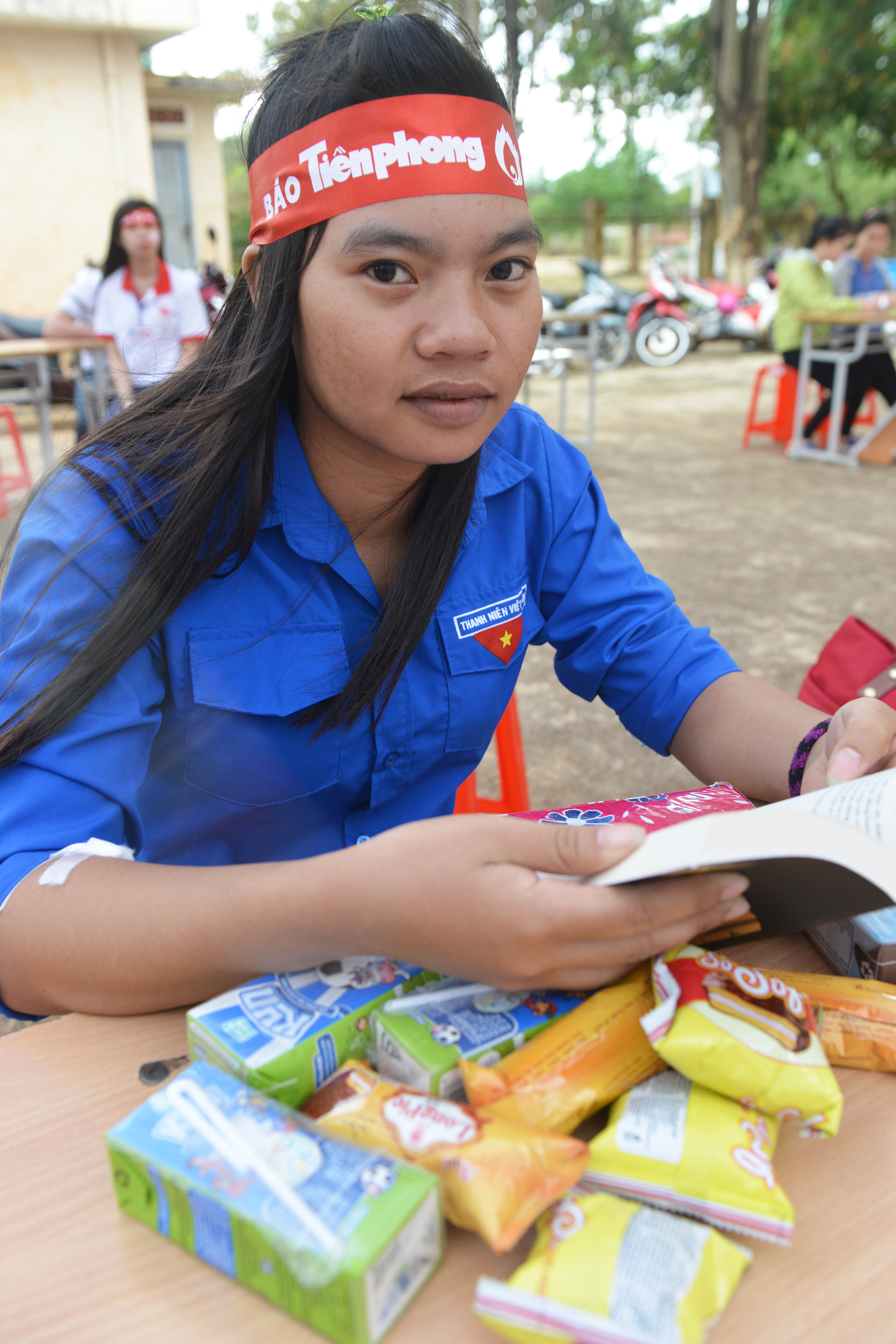Trên ghế nằm hiến máu, nữ SV năm 2 khoa Giáo dục chính trị H’Phố Êban, người dân tộc Ê Đê vui thích kể : Hồi học phổ thông, có lần H’Phố đã đi hiến máu nhưng bước lên cân lại không đủ ký. Lần này để cho chắc, cả tháng qua H’Phố đã ráng ăn rất nhiều cho mập, nên sức khỏe tốt lắm rồi.