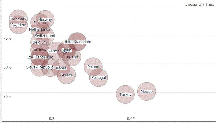 Percentage of people expressing high level of trust in others (2008) vs. income inequality by Gini index (mid-2000s) – Max Roser3