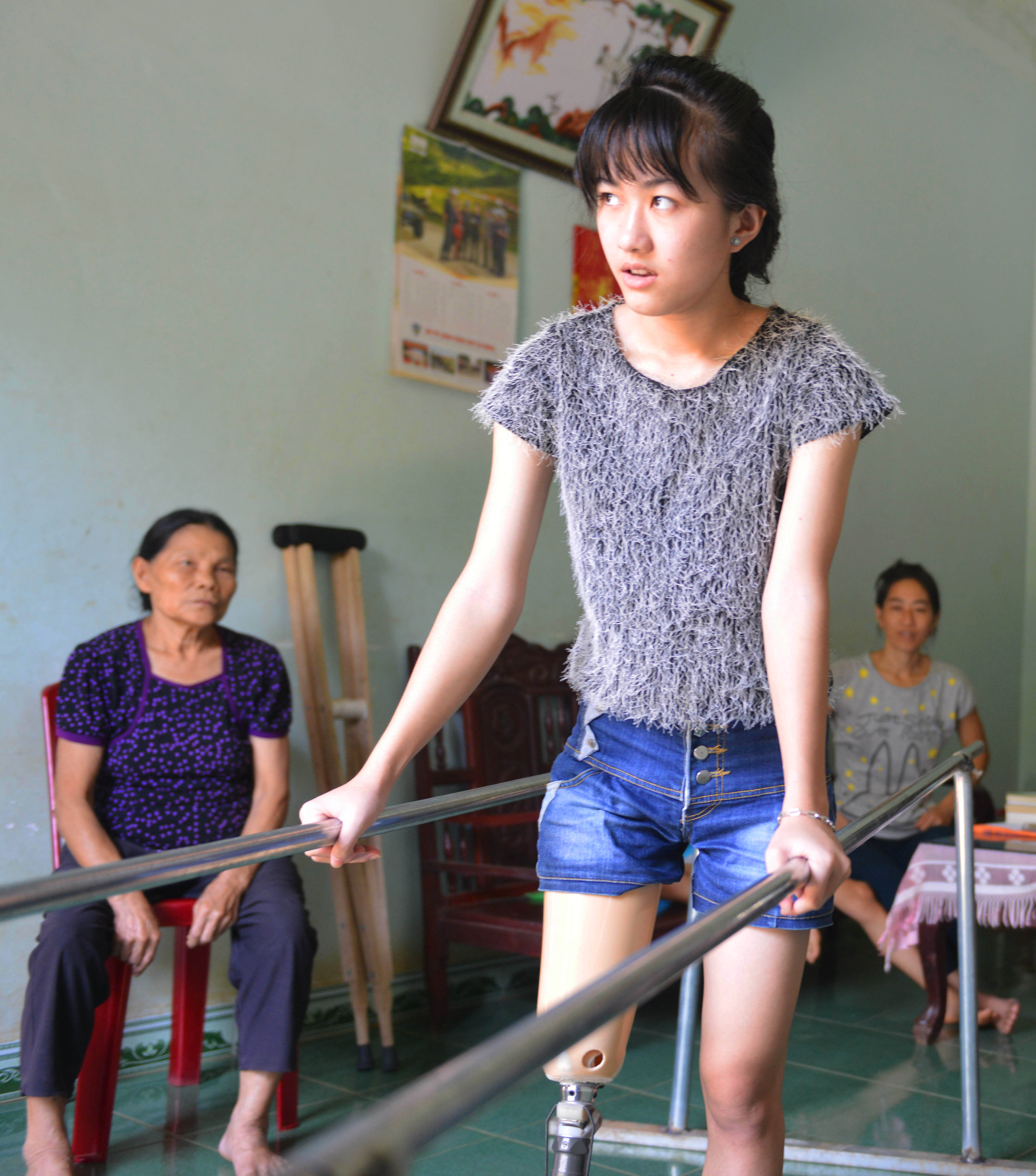 Vừa trò chuyện với chúng tôi, Vi vừa tự băng chặt lại mỏm chân cụt theo lời dặn của các bác sĩ, kỹ sư bệnh viện Chỉnh hình và Phục hồi chức năng Tp Hồ Chí Minh, là cần băng thường xuyên cho mỏm chân teo chắc, để tháng sau trở lại tái khám sẽ được đo ni thay phần lắp trên khớp gối. Em cũng sẽ được thay đoạn chân giả hoàn thiện khác, để có thể đi đứng và mặc trang phục gần như mọi người lành lặn khác. Vết thương đau buốt, Vi cau mặt rịn mồ hôi trán nhưng vẫn gắng siết chặt băng, rồi cười tươi cho mọi người yên tâm.