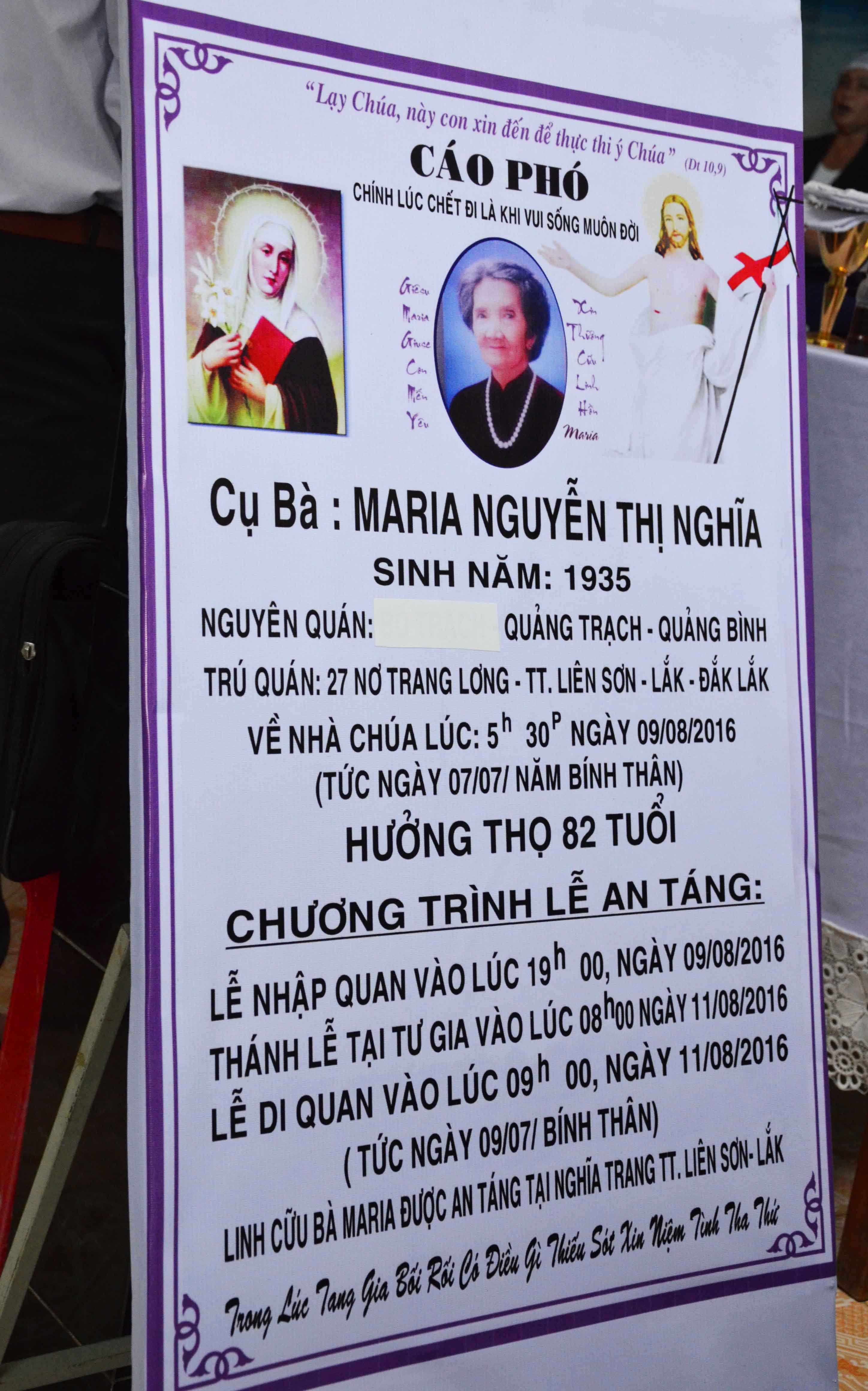 Chủ trì tang lễ là ông Đàng Năng Long- người sở hữu nhiều voi nhất Việt Nam hiện nay, cũng là người đầu tiên tổ chức rước dâu cho 2 cô con gái lớn về nhà chồng trên lưng voi, mà báo Tiền Phong đã phản ánh qua 2 phóng sự ảnh độc quyền về lễ cưới rước dâu trên lưng voi vào năm 2010, và 2013. Trước khi nắp áo quan đóng kín, dân chúng dự lễ đều nhìn thấy mẹ ông, cụ bà Maria Nguyễn Thị Nghĩa sinh năm 1935 tại huyện Bố Trạch tỉnh Quảng Bình, từ trần ngày 9/8/2016, nét mặt thanh thản hiền hòa như vẫn yên lành trong giấc ngủ ngon .