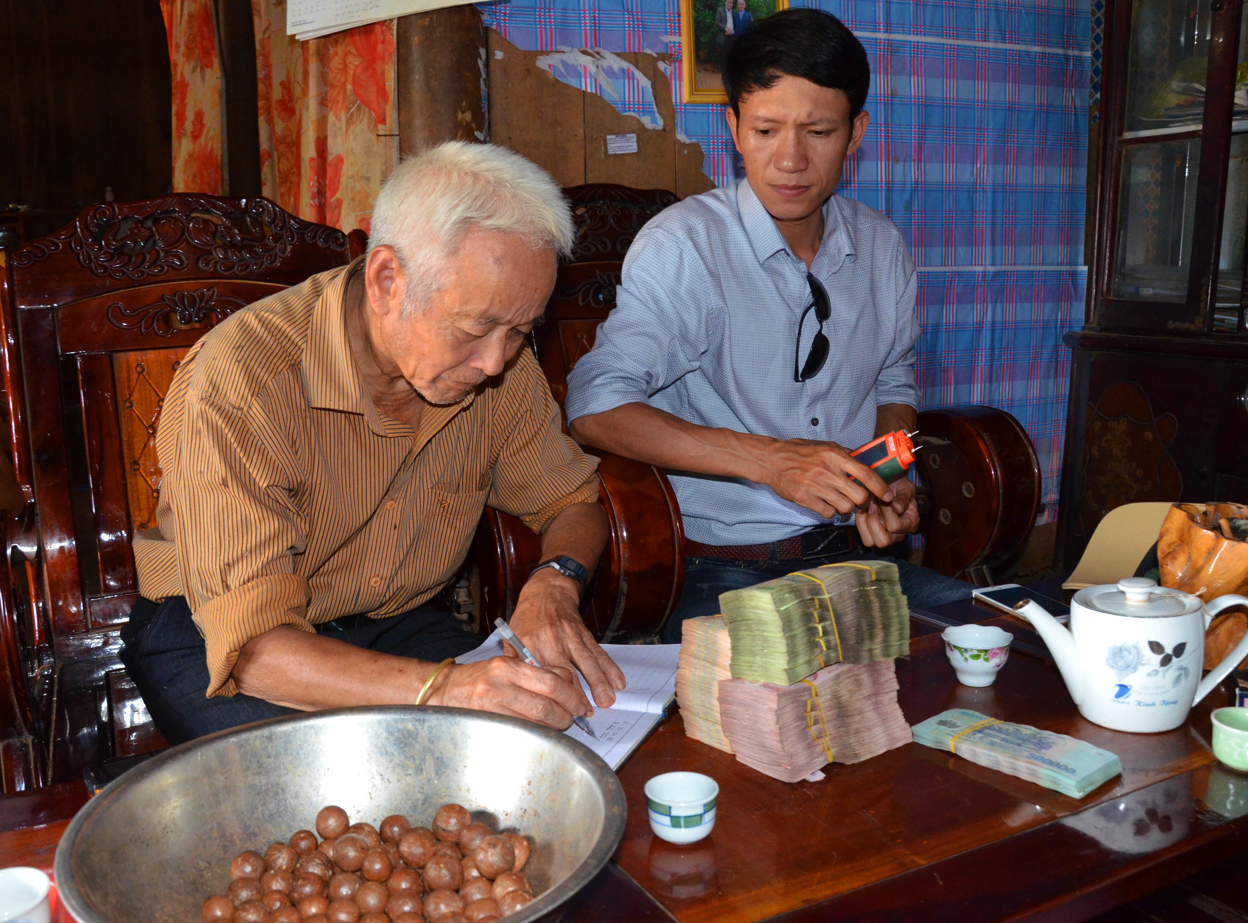 Tặng luôn máy đo độ ẩm, thước đo cỡ hạt sau khi đã hướng dẫn cách sử dụng cho bố con ông Đại, đặt trước mặt ông Đại mấy xấp tiền, anh Dũng thưa: Đây là 250 triệu đồng cháu đặt trước, để mua hết mắc ca trong vườn và nhờ bác mua giúp cháu thêm mắc ca của các hộ xung quanh. Ước tính 800 cây mắc ca nhà bác cho khoảng 1,5 tấn hạt, giá nhân xô 90.000đ/ký, bác có khoảng 135 triệu vụ này !