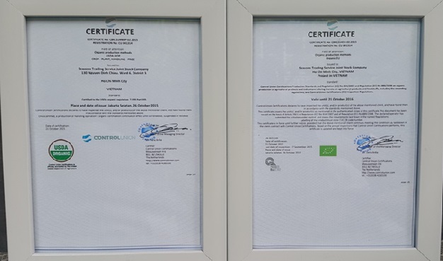 Giấy chứng nhận sản phẩm hữu cơ theo tiêu chuẩn Mỹ và Châu Âu được trao cho Cty CP Thương mại – Dịch vụ Mùa.