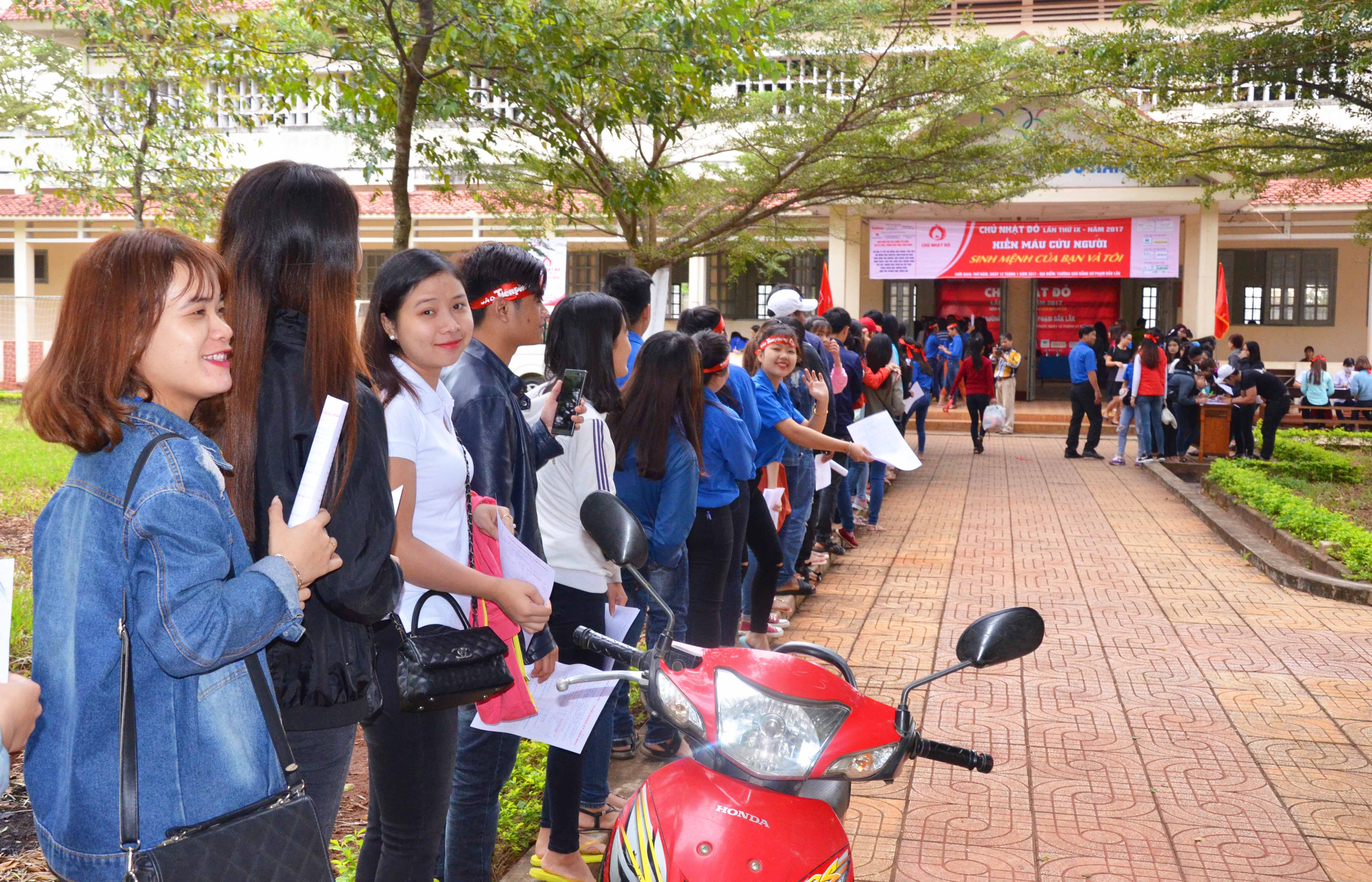 Từ 7 giờ sáng, đoàn bác sĩ-kỹ thuật viên của Trung tâm huyết học và Truyền máu tỉnh, bệnh viện Đa khoa tỉnh Đắk Lắk đã có mặt với đầy đủ trang thiết bị thăm khám, tiếp nhận máu. Gần 500 sinh viên trường Cao đẳng sư phạm cũng tập trung xếp hàng chờ được khám sàng lọc và hiến máu.