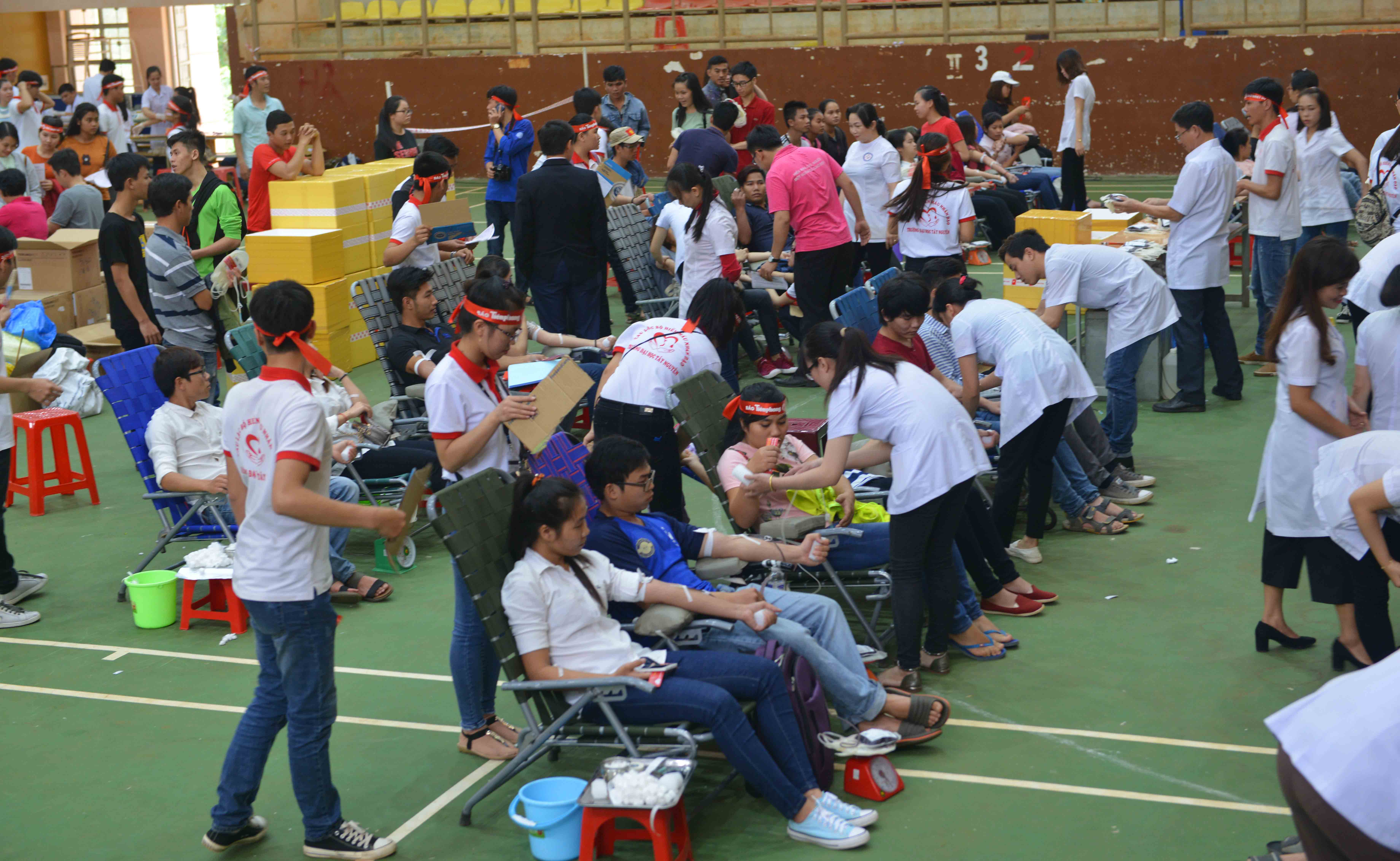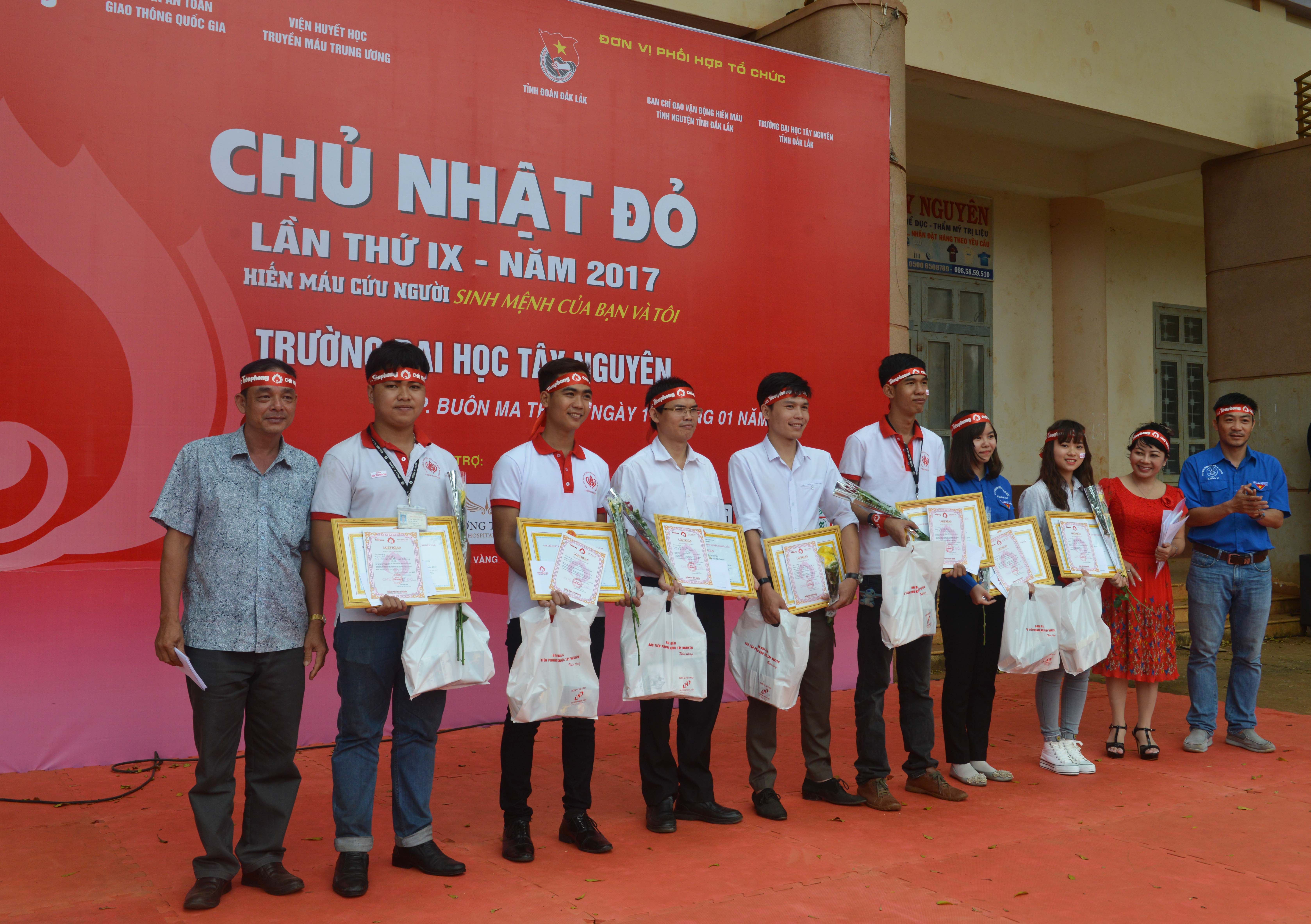 Lễ tôn vinh những cá nhân, đơn vị xuất sắc về hiến máu tình nguyện trong chương trình Chủ Nhật Đỏ tại trường Đại học Tây Nguyên bắt đầu lúc 14h30’ ngày 14/1/2017. Trước giờ khai mạc, những nhóm tình nguyện đặc biệt đã đến hiến máu, gồm đoàn cán bộ, giáo viên trường phổ thông 3 cấp Hoàng Việt do 2 thầy phó hiệu trưởng dẫn đầu, và Câu lạc bộ Sức trẻ Tây Nguyên.