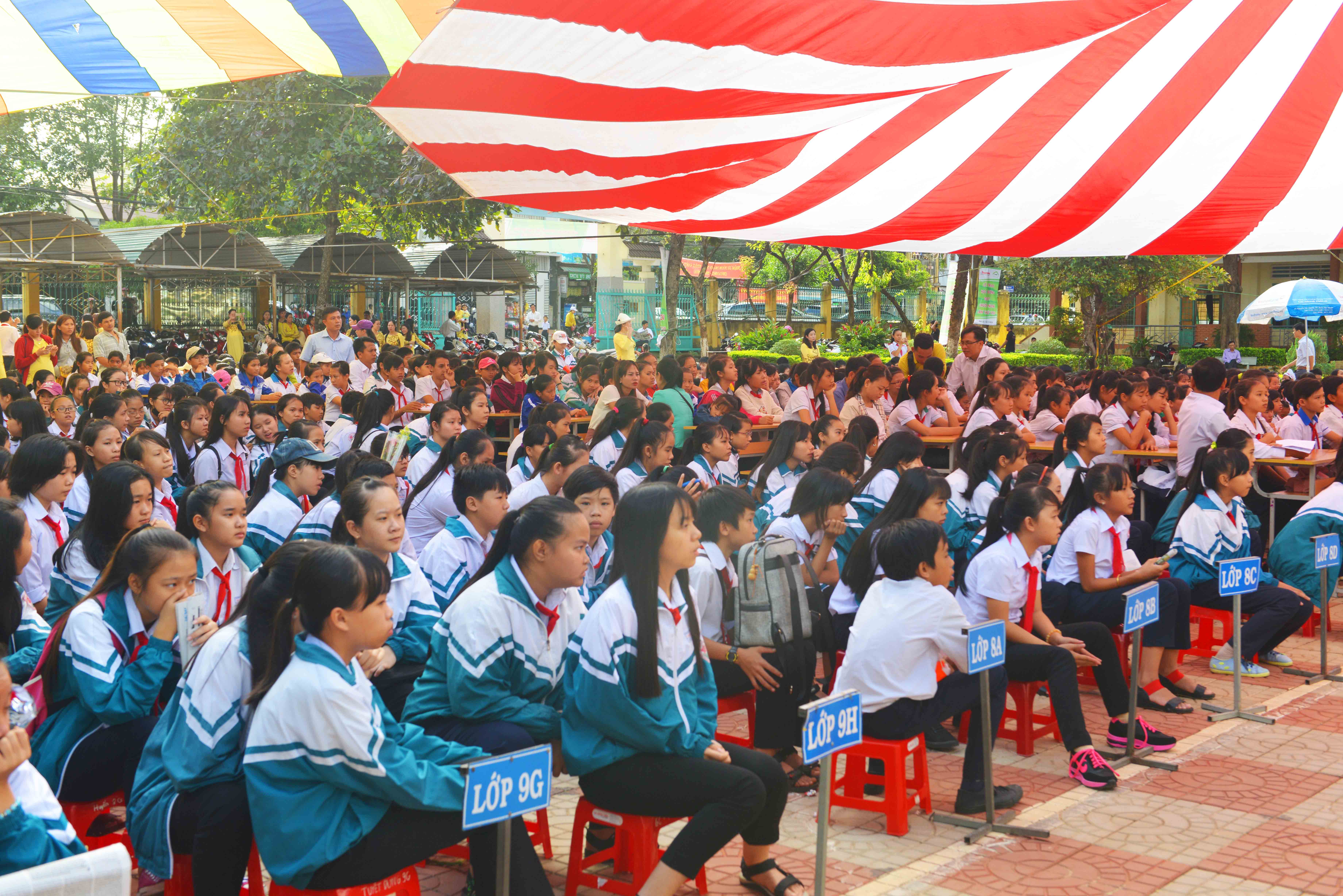 Khách mời và học sinh ngồi dưới bóng mát của những chiếc dù