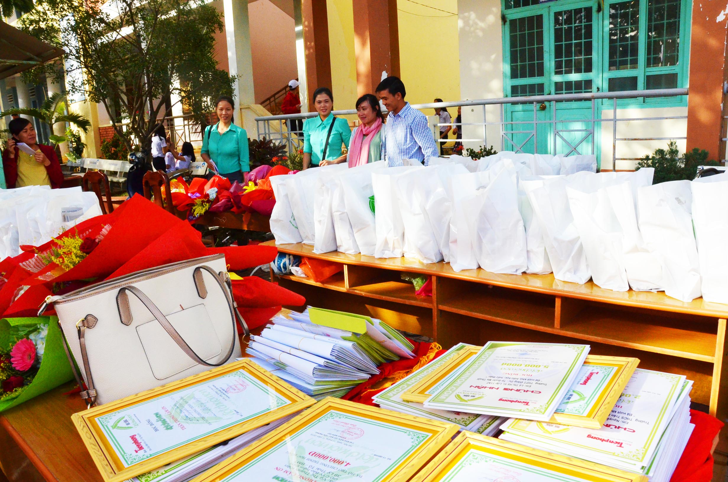 Bà Nicole cùng ông Thái Văn Tài phó giám đốc sở GDĐT Đắk Lắk trao các phong bì học bổng do Hội Hữu nghị tự thiết kế