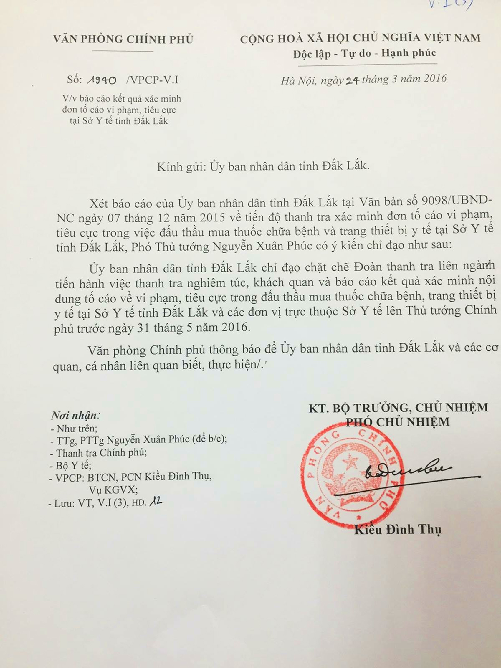 Văn bản chỉ đạo số 1940 của VP Chính Phủ về làm rõ các sai phạm của Y tế Đắk Lắk