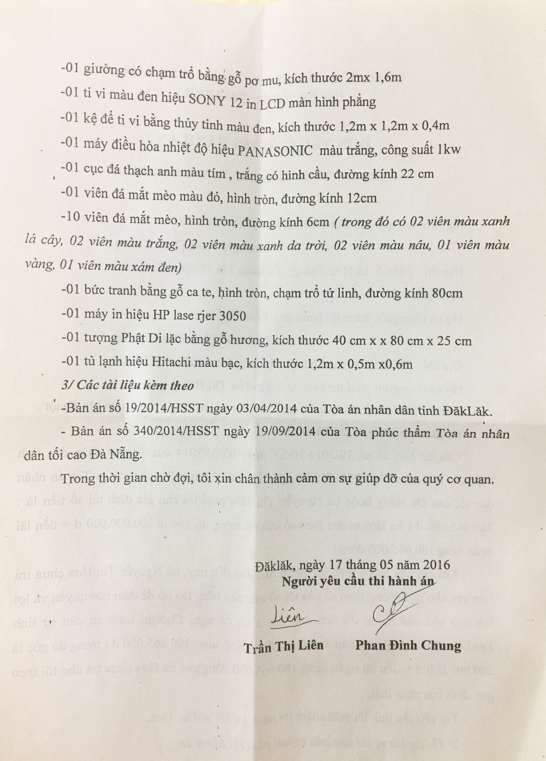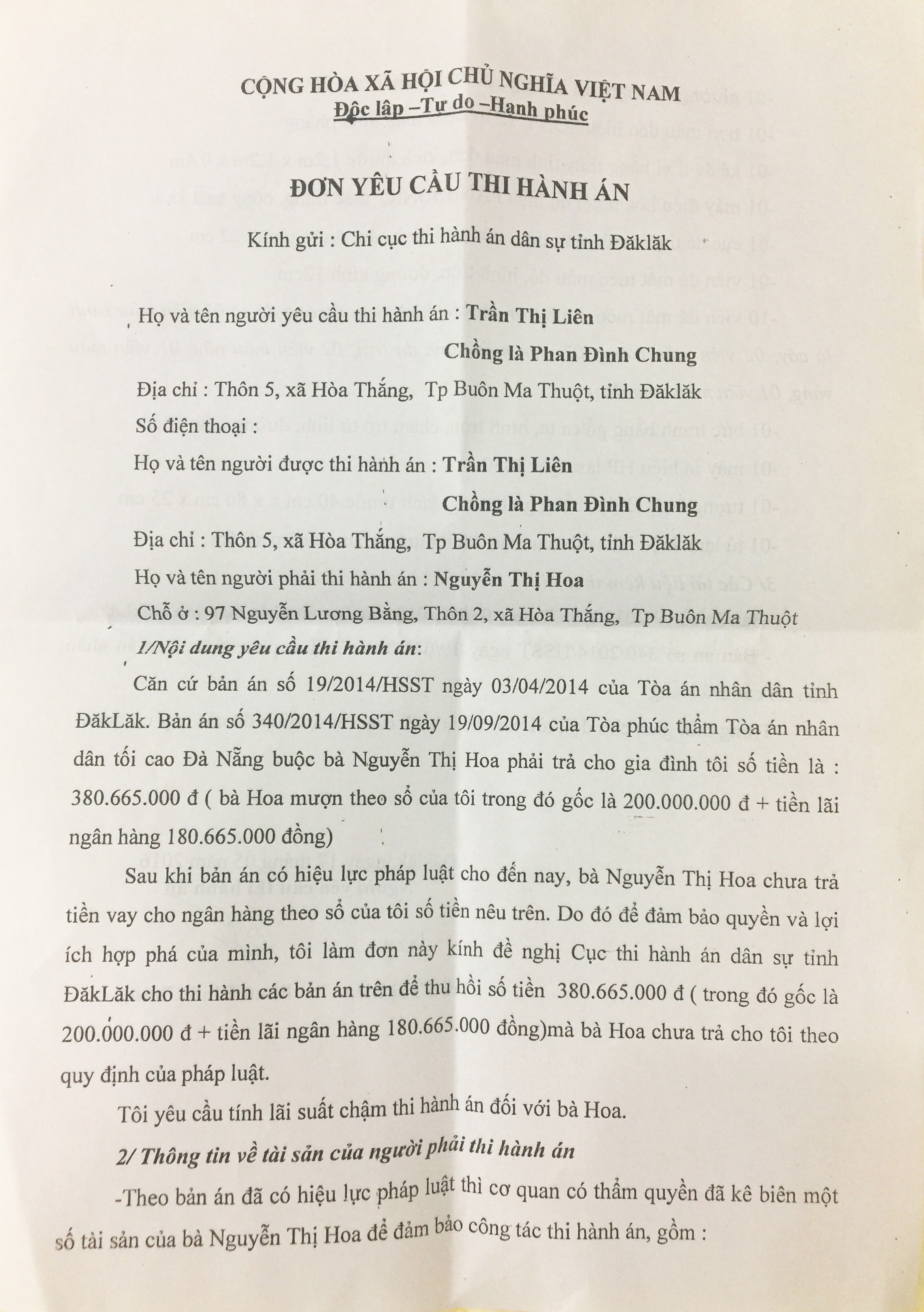 Điều gây hoang mang dư luận hồi cuối vụ án, là khoảng 20 tỉ đồng “nợ xấu” còn lại do cò Hoa đã vào tù, ngân hàng buộc các chủ hộ đã ký vào giấy nhận tiền, bất kể họ thực nhận hay bị cò Hoa lừa lấy hết, vẫn phải trả đủ cho ngân hàng cả nợ gốc lẫn lãi. Giữa tháng 4/2017, một nhóm cán bộ thi hành án 3 người lại tìm đến nhà bà Liên. Do bà Liên đi vắng, nhóm cán bộ nhờ hàng xóm bà Liên nhắn lại: Cả 2 lô đất mà vợ chồng Chung-Liên đã thế chấp vay ngân hàng, giá thị trường hiện chỉ hơn 200 triệu đồng. Trong khi nợ gốc 300 triệu cộng lãi từ đó tới nay đã gần 700 triệu đồng. Vợ chồng Chung- Liên còn mấy sào rẫy nữa, gom vô trả nốt, tự nguyện giao tài sản đi ! Chiều cùng ngày, bà Liên phải ra làm việc với cơ quan Thi hành án.