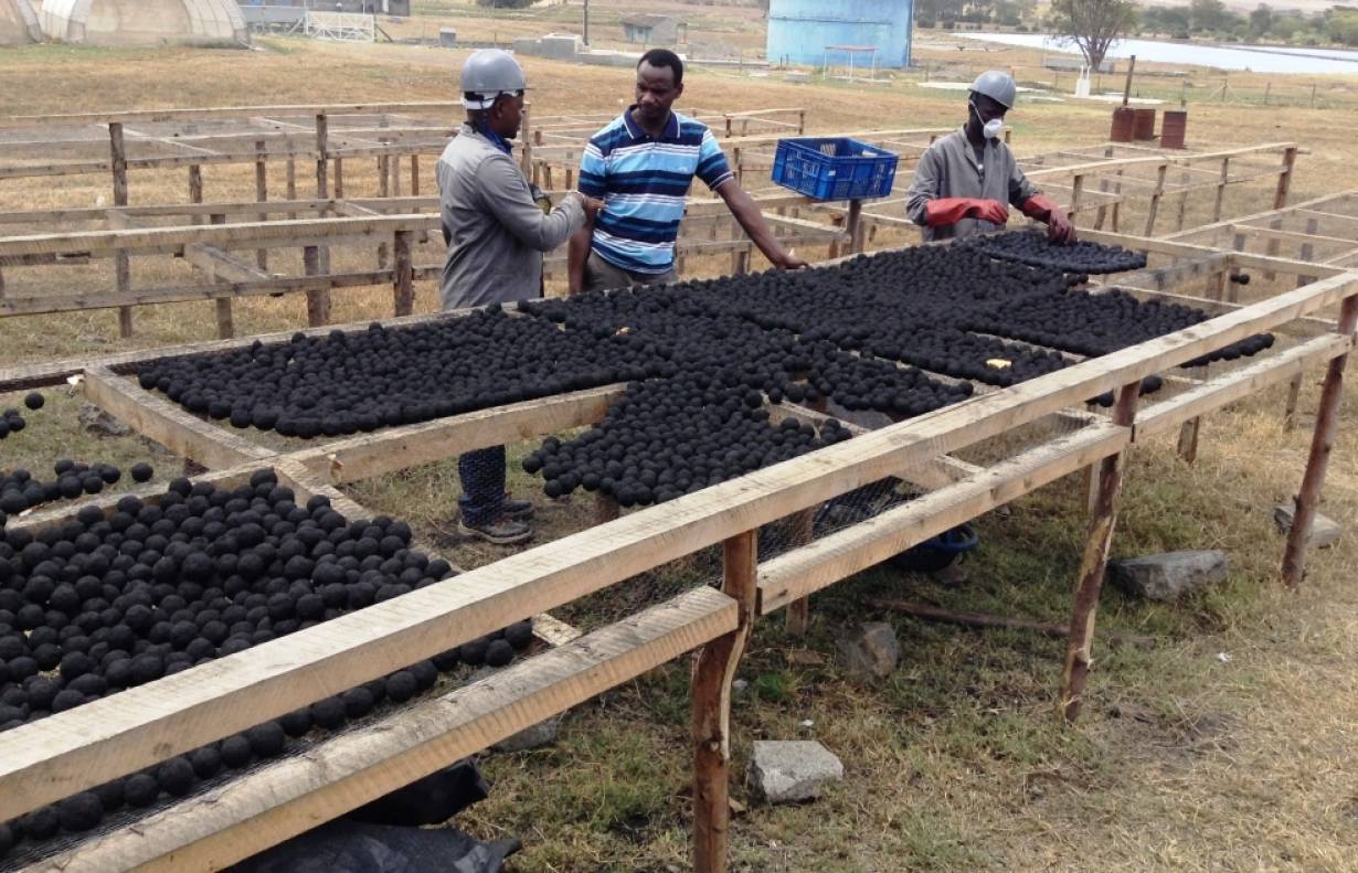 Wet fuel briquettes made from human waste and sawdust are dried outside at the Nakuru Water and Sanitation Services Company plant in Nakuru, Kenya, April 8, 2017. TRF/ Be