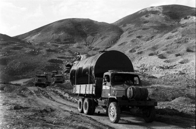 The long road: Supply trucks slowly make their way through hundreds of bomb craters.