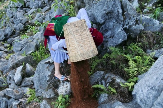 Men and women in Sung Po B Hamlet, Sung Tra Commune, Meo Vac Distric begin their day in the early morning hours, plodding through rugged paths on their way to the fields. Each carries the burden of soil-filled bags ready to be emptied into ditches along the mountainside so that seeds can be planted.