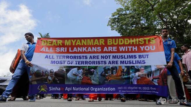 Sri Lankan Buddhists march in a rally showing solidarity to Buddhists in Myanmar, in Colombo, Sri Lanka on Sep 15, 2017. (Photo: AP/Eranga Jayawardena)