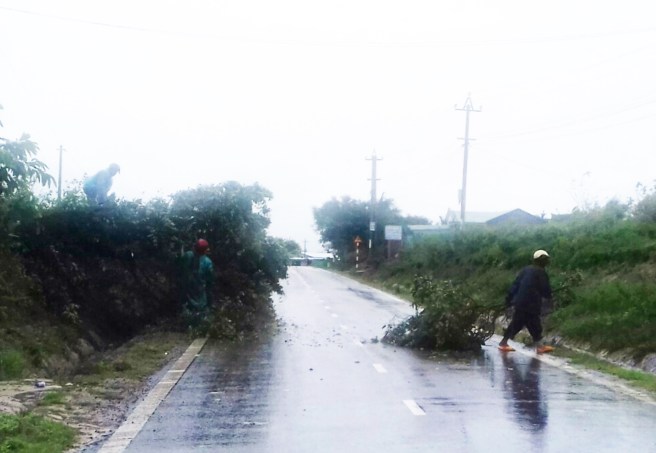 Đường Đông Trường Sơn khu vực huyện Krông Pa, Gia Lai có nhiều cây bị gió quật đổ chắn ngang.