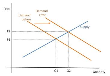 Nếu vì lý do nào đó mà cầu tăng đột biến, trong khi cung chưa kịp tăng thì giá sẽ tăng lên. Xem ảnh bên dưới, giá tăng từ P1 lên P2 vì đường cầu (demand) chuyển động do cầu tăng đột biến.