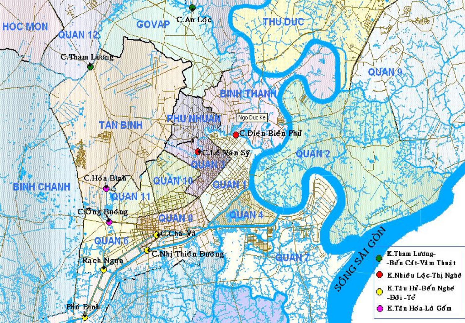 Bản đồ vị trí các trạm quan trắc chất lượng nước kênh rạch nội thành TP.HCM (Chi cục Bảo vệ Môi trường, Sở Tài Nguyên và Môi trường TP HCM)