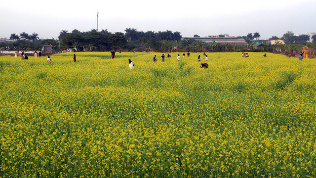 A canola field is filled with its signature yellow blooms in a Hanoi suburb. Photo: Tuoi Tre