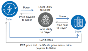 Tuy nhiên trong một Hợp đồng mua bán điện trực tiếp, tất nhiên không có giao nhận vật lý nào giữa hai bên cả. Việc kết nối với nguồn sạch sẽ bị chia cách dưới một hợp đồng nhân tạo và bản chất phi vật thể của giao dịch có thể gây ra những thách thức cho người mua, vì họ bị phụ thuộc vào những thỏa thuận này để cung cấp thông tin đầu vào cho các báo cáo môi trường và tiếp thị tin cậy. Do đó, tùy thị trường, các giao dịch cũng sẽ bao gồm việc chuyển giao cho người mua giấy chứng nhận năng lượng tái tạo hoặc bảo lãnh xuất xứ (như ở thị trường Châu Âu) được trao cho dự án hoặc được mua bán trên thị trường (cho phép người bán bán giấy chứng nhận mà họ được cấp).