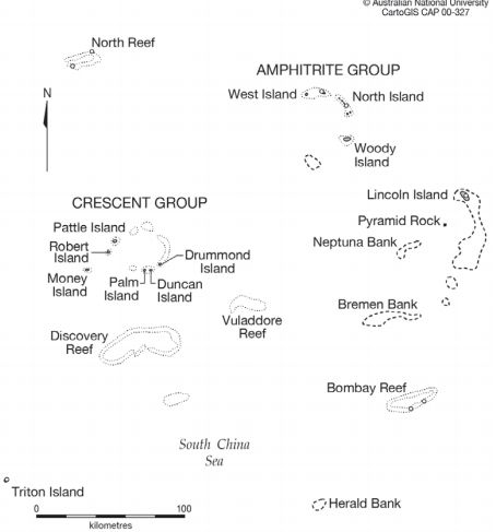| Bản đồ 3 Nguồn: “Hoàng Sa, Biển Đông,” [CartoGIS] Maps Online: ANU [Australian National University] College of Asia & the Pacific, asiapacific.anu.edu.au/mapsonline/ |