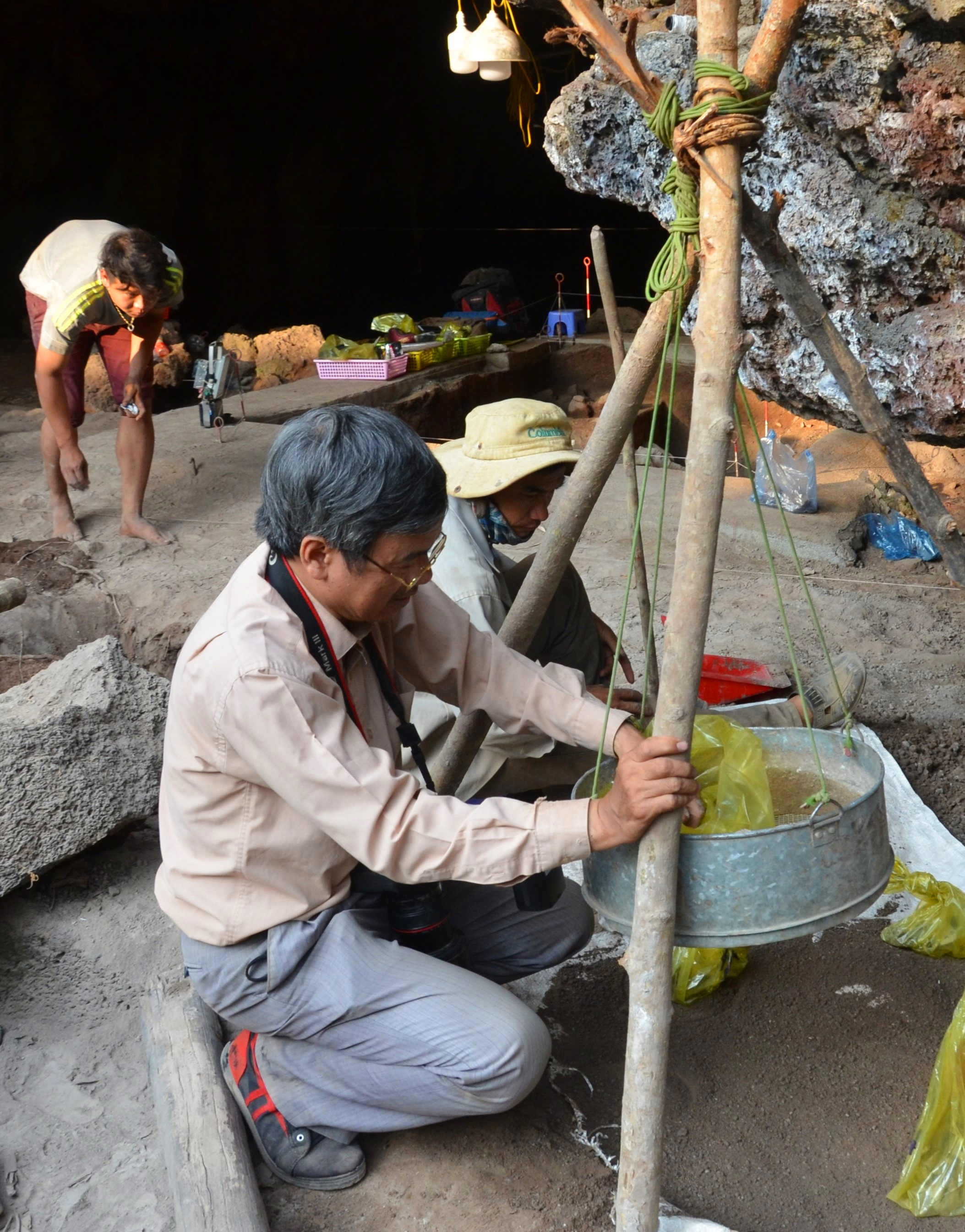 Nhưng phát hiện mới nhất, quan trọng nhất vẫn đang ở dưới đáy hố sâu kia. Nắng chiều rọi xuống vách hang được phụ trợ thêm bởi hệ thống đèn các loại, soi rõ dáng người đang nửa nằm, nửa ngồi cần mẫn dùng chai có vòi xịt từng tí nước, rồi nhẹ nhàng dùng thìa chuyên dụng tỉ mỉ nạo đất quanh một mảng di vật tròn to, lộ dần hình dáng của một … sọ người. Sau hơn nửa giờ nạo vét, ông nhường chỗ cho ThS Vũ Tiến Đức.