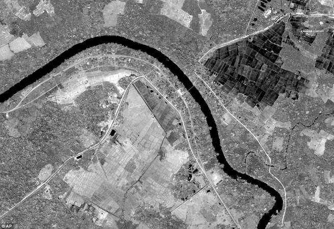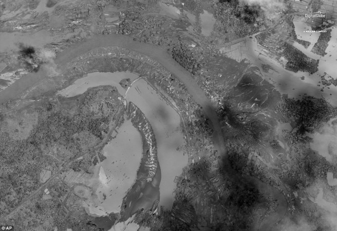 Làng Ban Hinlat ở tỉnh Champasak trước và sau sự cố vỡ đập/Ảnh: dailymail.co.uk