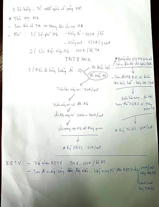 Đoạn, Dũng lấy ra 1 tờ tiền mệnh giá 200.000 đồng, kẹp vào trong 1 tờ giấy A4 gập đôi rồi nhét vào giữa bộ hồ sơ công ty vừa giao rồi ngoắc tay, dẫn tôi tới khu vực có dòng chữ in trên kính “Nộp lệ phí hải quan”. Khu vực này hiện đã có 3, 4 người khác chờ đến lượt. Dũng rỉ tai: “Quy định của nhà nước chỉ 20.000 đồng/bộ tờ khai. Nhưng “luật” ở đây là thế, không thể làm khác”.