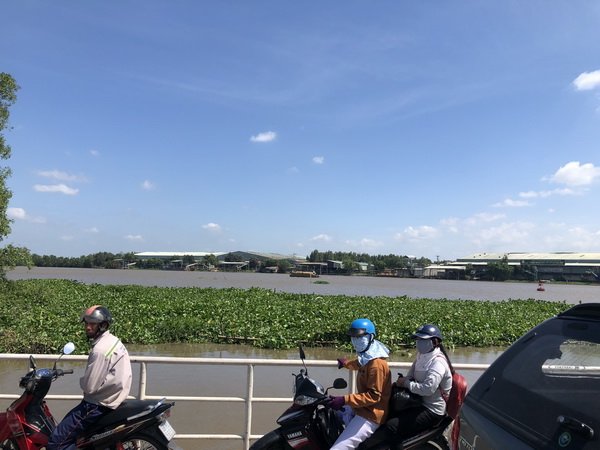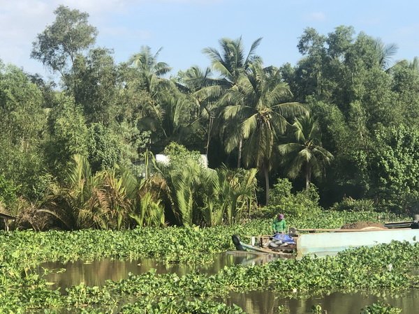 | Con sông lớn ở huyện An Minh, Kiên Giang cũng chịu chung số phận lục bình. Tàu thuyền qua lại rất khó khăn, thỉnh thoảng phải dững lại gỡ rác, lục bình khỏi chân vịt. |
