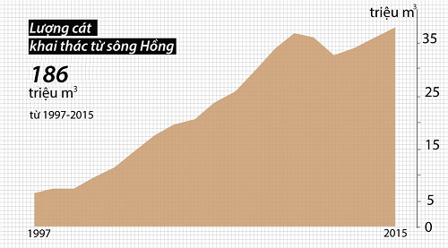 Trong vòng mười lăm năm, từ 1997 đến 2012, gần 244 triệu mét khối cát đã bị lấy đi khỏi lòng sông Hồng. Nhiều nhất là ngã ba Việt Trì đến ngã ba tam tỉnh Hưng Yên – Hà Nam – Thái Bình. Có năm khối lượng cát bị lấy đi (theo nguồn thống kê được) riêng tại Hà Nội lớn gấp 3 lần lượng phù sa về tới Sơn Tây.
