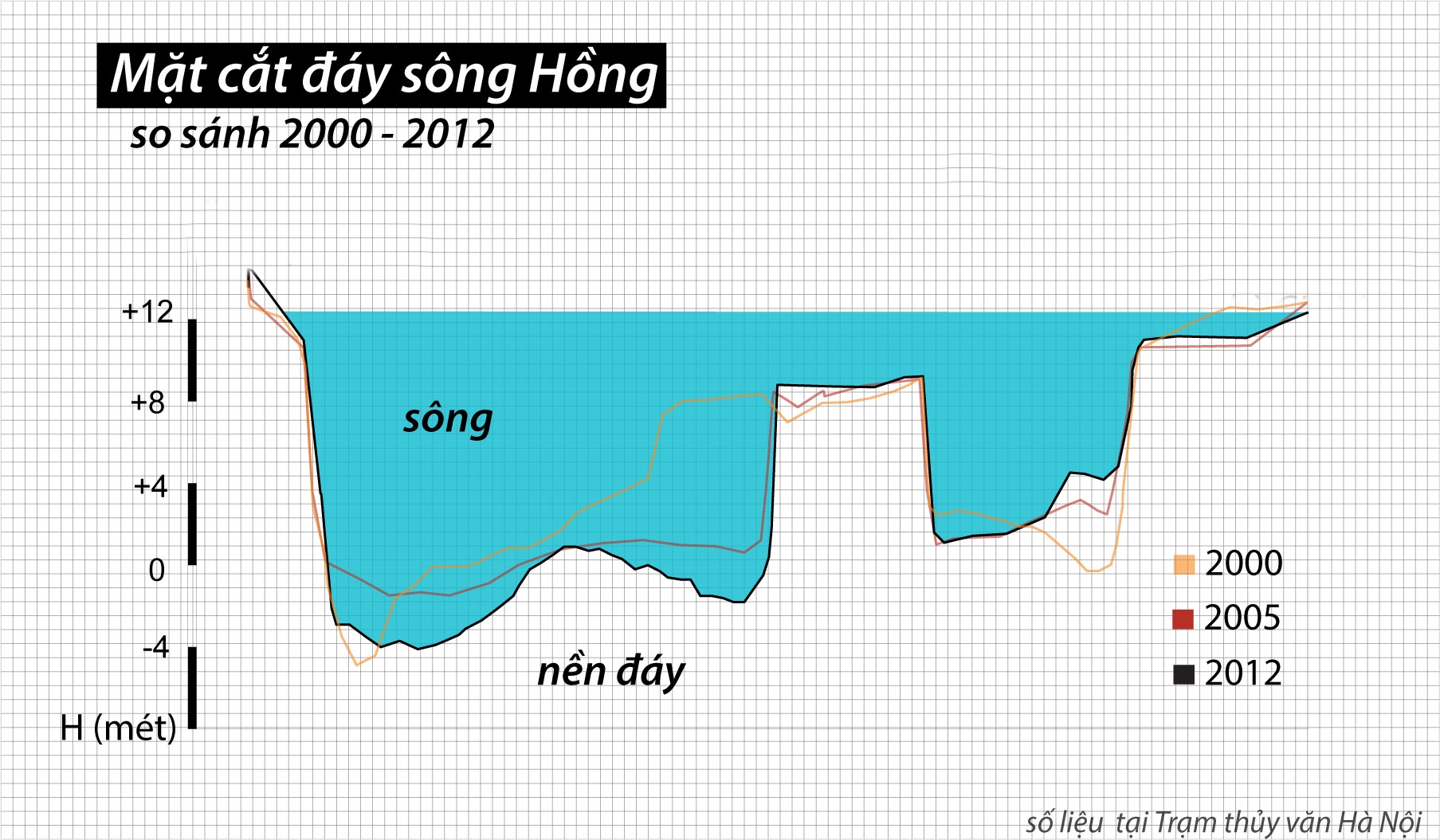 Mặt cắt đáy thể hiện sự biến dạng của sông Hồng. Hiện tượng xói sâu bắt đầu từ những năm 2000. Cho đến năm 2012, diện tích mặt cắt ngang dòng dẫn chính đã tăng 40% so với năm 2000. Điều này khiến mực nước sông hạ xuống.