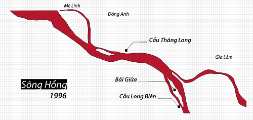Những người dân nội thành cũng rất dễ nhận ra sự biến đổi ở khu vực cầu Long Biên: trong thập kỷ 80 và 90, Bãi Giữa từng tách biệt với trung tâm thành phố bởi một nhánh sông. Nay nhánh sông đó đã biến mất, chỉ còn một vùng ngập nước xâm xấp. Một bãi bồi mới gần đó cũng đang hình thành.