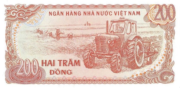 Năm 1987, tờ tiền mệnh giá 200 đồng ra đời. Trong khung cảnh trên tờ giấy bạc, là cánh đồng lúa đang vào vụ. Nổi bật là chiếc máy cày MTZ-50. Phía sau là năm người nông dân đang thu hoạch lúa trên một cánh đồng. Người gặt, người ôm, người gánh.
