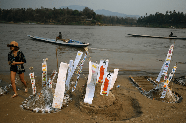 Hình chụp ngày 14 tháng 4 cho thấy một du khách đi ngang đụn cát hay “Toppathatsay” trên bờ sông Mekong đánh dấu năm mới ở Lào hay “Pi Mai” tổ chức ở Luang Prabang. [Ảnh: Manan Vatsyayana/AFP]