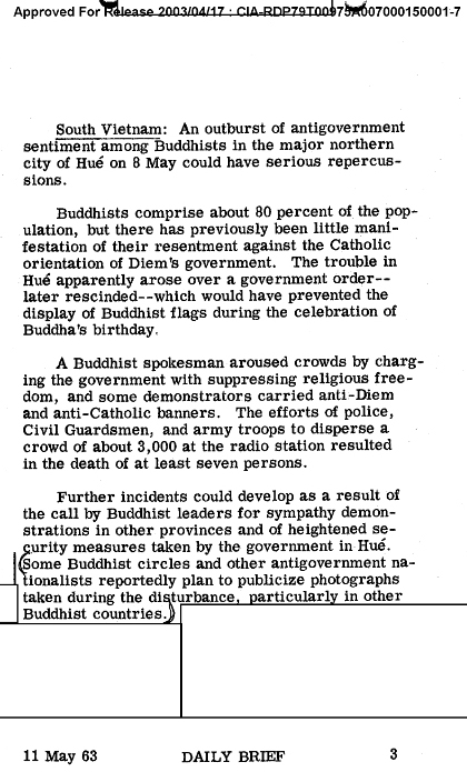 Kèm bản dịch sẽ là phóng ảnh trang 3 hồ sơ dạng .jpg, và hồ sơ nguyên bản PDF. Tựa đề “CIA Báo Cáo Tổng Thống Mỹ Về Cuộc Thảm Sát Huế 1963” là của người dịch ghi vào, để khỏi nhầm với các hồ sơ CIA khác đã dịch. Sau đây là bản dịch thực hiện bởi Cư Sĩ Nguyên Giác.)