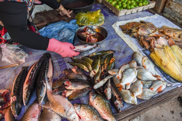 “5 hay 10 năm trước, [chúng tôi đã mua] một cân cá với giá 4.000 hoặc 5.000 riel (1,20 đô la)”, anh vừa nói vừa chỉ vào con cá đang nướng. Bây giờ thì cá quả con (tiếng địa phương là trey rors) cũng có giá 10.000 riel/kg.