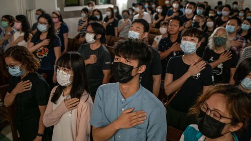 Pro-democracy supporters make a gesture as they sing a song during a memorial service in a church. (Photo by Anthony Kwan/Getty Images) (Getty)