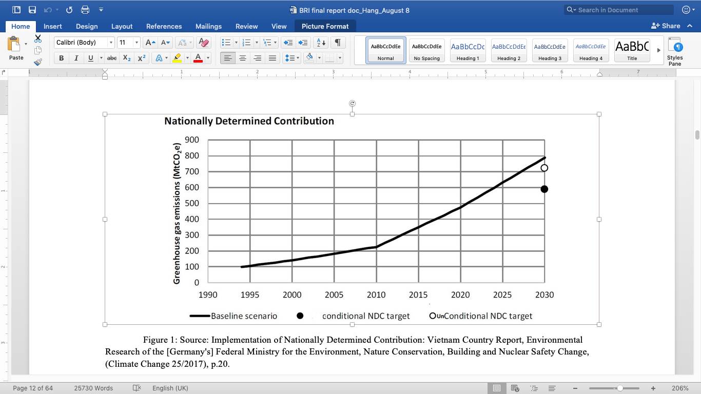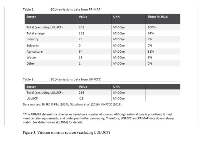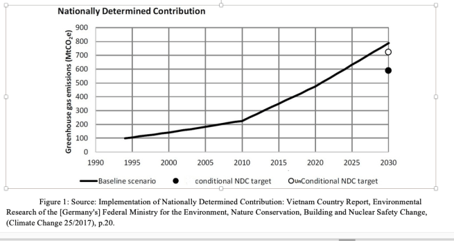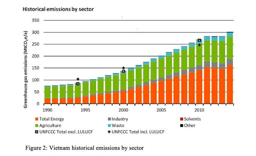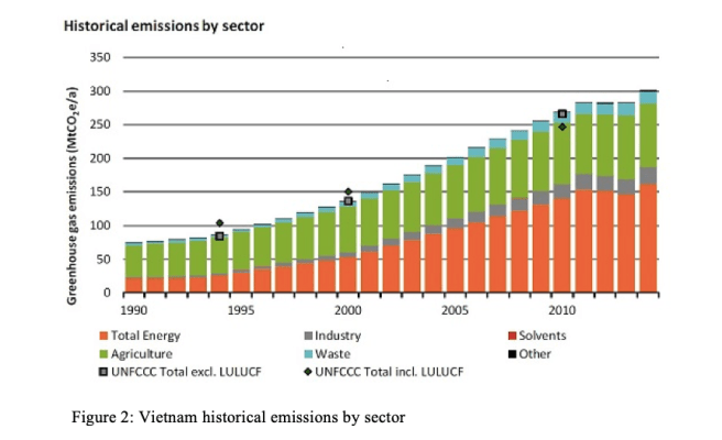 Theo NDC của Việt Nam, năm 2010, tổng lượng khí thải quốc gia lên tới 246,8 triệu tấn CO2eq. Đến năm 2020, ước tính tăng lên 474,1 triệu tấn CO2eq và đạt 787,4 triệu tấn CO2eq vào năm 2030 theo kịch bản BAU.[13]