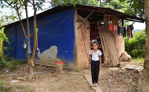 Nữ sinh H’Sia Hmok trước túp lều của 2 ông cháu