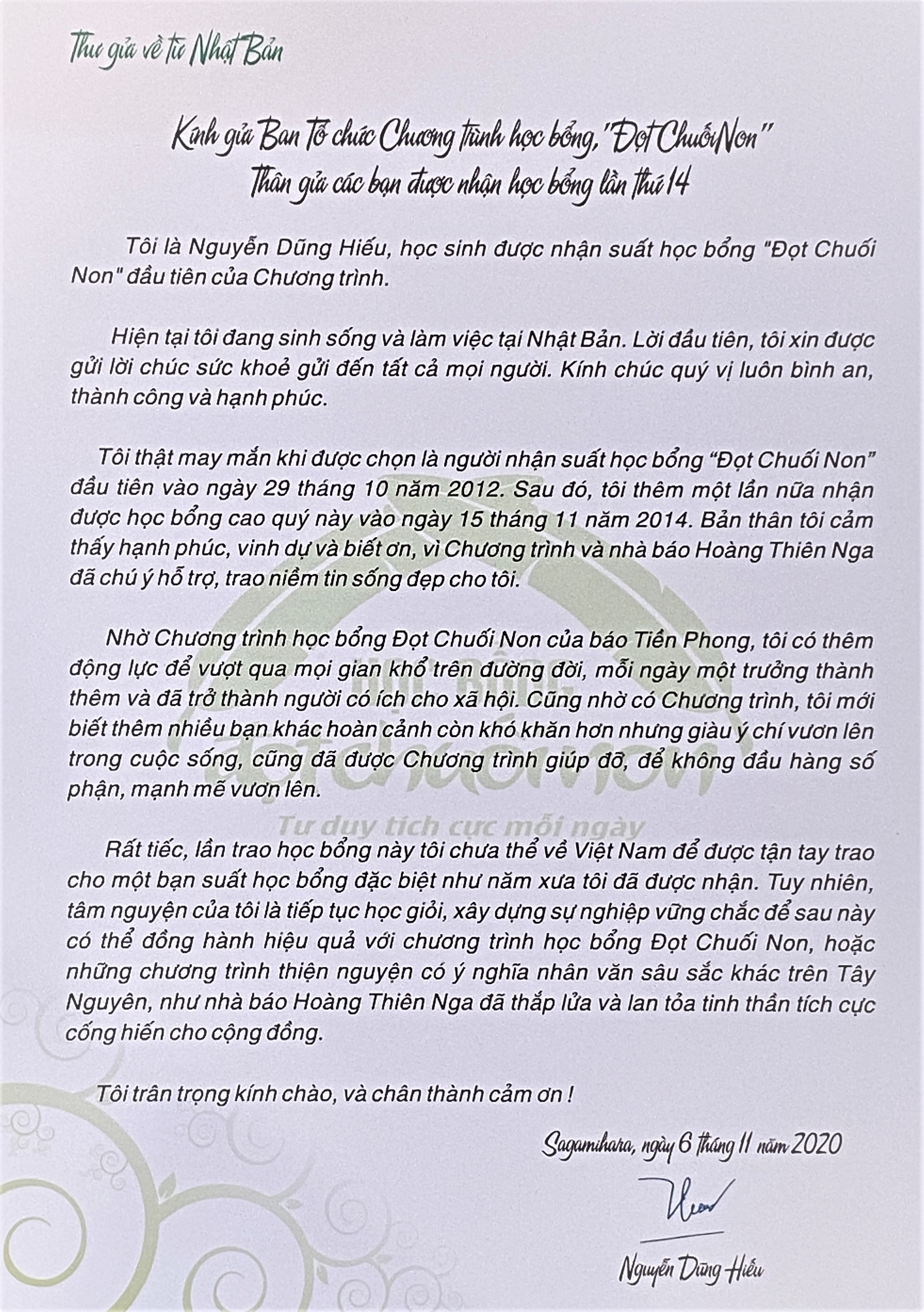 Từ thành phố Sagamihara- một đô thị lớn Nhật Bản, Nguyễn Dũng Hiếu nhắn cho tôi biết: vì vướng nhiều trở ngại do Covid-19, mà dự định về Việt Nam để được tận tay trao suất học bổng Đọt Chuối Non của anh đã không thành. Hiếu là học sinh được nhận học bổng Đọt Chuối Non đặc biệt đầu tiên vào tháng 10/2012, khi chương trình vừa nhen nhóm. Hai năm sau, Hiếu được trao thêm 1 lần học bổng nữa vào tháng 11/2014. Cậu học sinh lớp 9 mồ côi cha khi đó phải tự kiếm sống nuôi thân, trong lúc anh trai Cảnh Trung của Hiếu phải nghỉ học để làm thuê nuôi mẹ chạy thận nhân tạo 3 lần mỗi tuần, hiếu thảo chăm lo tới khi mẹ mất. Nay Hiếu đã trở thành công nhân kỹ thuật giỏi nghề xây dựng ở đất nước hoa anh đào, Cảnh Trung cũng vừa nhận bằng tốt nghiệp đại học. Chuyển khoản góp thêm suất học bổng, Hiếu tâm sự em hiểu giá trị của việc nhận được học bổng đúng lúc gia cảnh ngặt nghèo nhất, nên luôn khao khát sớm trở thành người truyền lửa yêu thương.