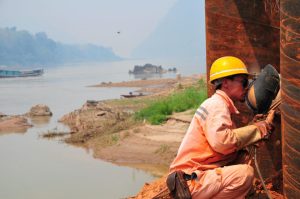 Một người thợ hàn làm việc trên cầu bắt ngang sông Mekong,