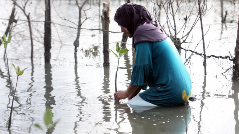 Một người trồng rừng ngập mặn tại khu vực bờ biển ở Banda Aceh, Indonesia. Rừng đang được trồng lại ở đây để tạo vách chắn lũ tự nhiên. Ảnh: EPA/Jiji.