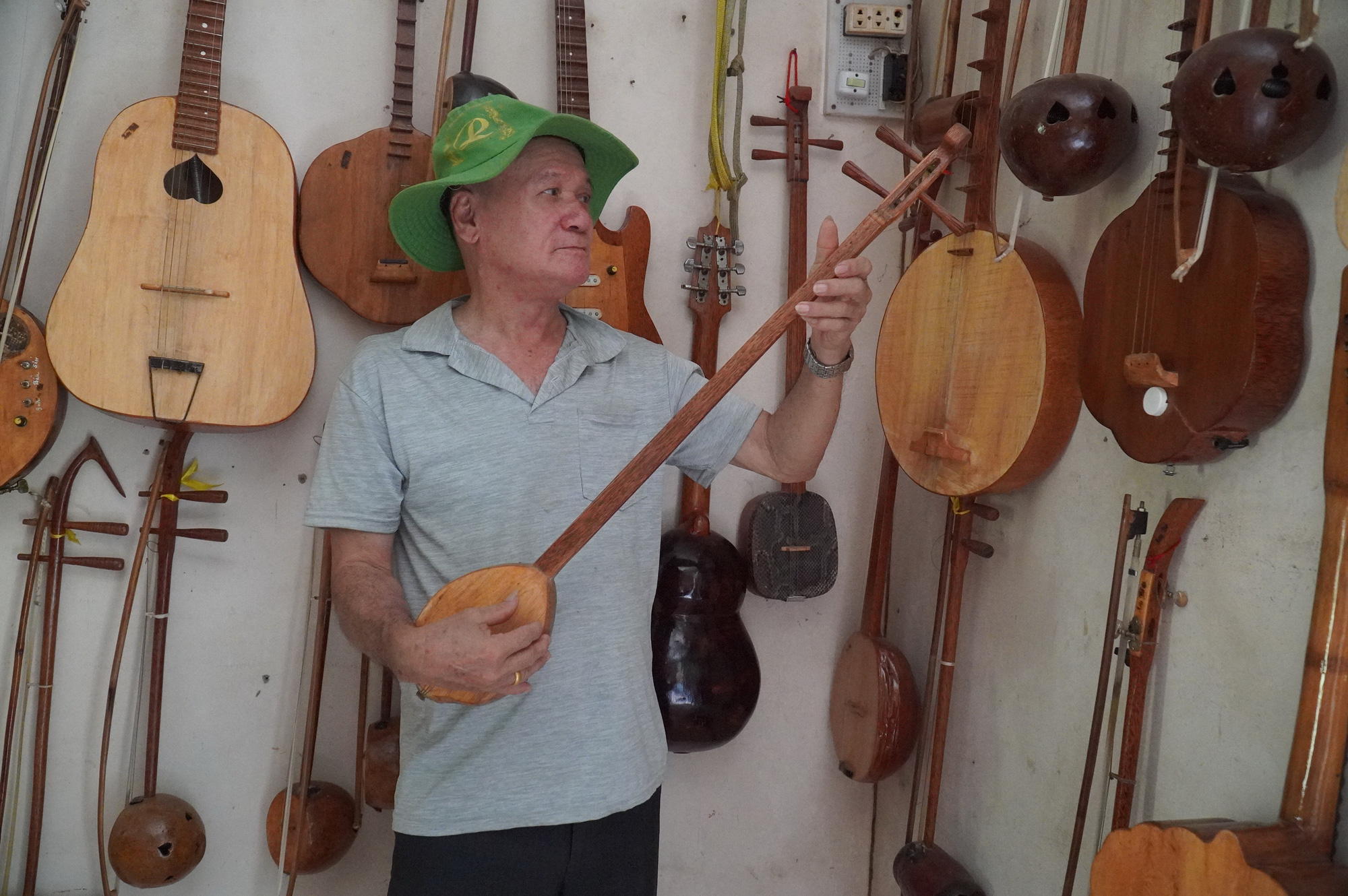 Ngoài việc tạo ra được hình dáng của nhạc cụ rồi, âm thanh của mỗi nhạc cụ phải chuẩn mới được”, ông chia sẻ. Bộ đàn “5 trong 1” này của ông gồm đàn bầu, đàn cò, đàn sến, guitar và một micro để hát rất tiện lợi giữa âm nhạc hiện đại và truyền thống.