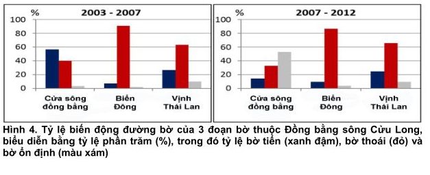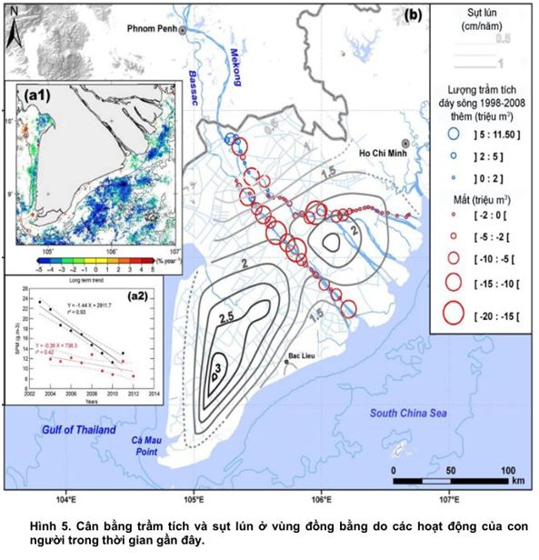 Trong khi dư luận quốc tế đang ngày càng quan tâm đến sự sống còn của các đồng bằng, thì Đồng Bằng Sông Cửu Long (ĐBSCL), đồng bằng lớn thứ ba trên thế giới, với dân số đông đúc, được xem như vùng sản xuất lương thực quan trọng nhất của khu vực Đông Nam Á và là nơi tập trung đa dạng sinh học quy mô thế giới đang ngày càng bị ảnh hưởng bởi các hoạt động của con người và đang xuất hiện hiện tượng sụt lún và xói lở bờ biển. Ở thượng nguồn sông Mekong, đã có khá nhiều đập thủy điện được xây dựng và nhiều đập thủy điện khác đang nằm quy hoạch. Từ ảnh vệ tinh SPOT 5 có độ phân giải cao, chúng tôi đã định lượng được sự xói lở bờ biển và mất đất trên quy mô lớn trong khoảng thời gian từ năm 2003 đến 2012, và sự ảnh hưởng đang diễn ra đối với hơn 50% của 600 km chiều dài bờ biển vốn đã và đang bị xâm thực mạnh mẽ. Hiện tượng xói lở xảy ra, mặc dù không có ghi nhận nào về sự thay đổi lưu lượng trên sông cũng như các điều kiện về sóng và gió trong thời gian nêu trên, được cho là có liên quan đến