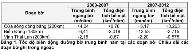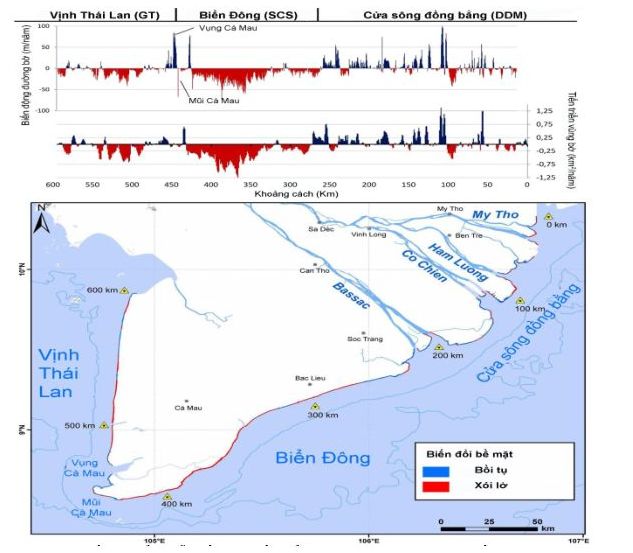 Giai đoạn 2003-2012, hơn 50% chiều dài đường bờ 600km của Đồng bằng sông Cửu Long có hiện tượng xói lở với sự biến đổi đường bờ đáng chú ý. Mặc dù xói lở ở đoạn bờ Vịnh Thái Lan năng lượng thấp ít nghiêm trọng hơn nhưng hiện tượng này cũng đã xảy ra với trên 60% chiều dài 200km của đoạn bờ này. Sự biến động đường bờ đã dẫn đến việc mất một khối lượng lớn đất đồng bằng dọc theo bờ phía Biển Đông và phía Vịnh Thái Lan và đây là vấn đề đang nhận được mối quan tâm ở Việt Nam. Giai đoạn 2003- 2012, đồng bằng ven biển sông Mekong đã bị mất hơn 5 km 2 đất là hậu quả của việc biển tiến mạnh mẽ. Trong đó riêng giai đoạn 2007-2012, vùng đồng bằng này mất đi một diện tích tương đương với 1.5 sân bóng đá mỗi ngày. Con số này là đáng kể cho một vùng đồng bằng vẫn được biết đến là có xu thế biển tiến mạnh mẽ.