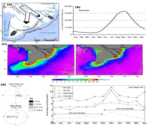 Chế độ thủy văn hàng năm theo mùa, với một mùa lũ gió mùa Tây Nam (từ tháng 5 đến tháng 10), khi đó trầm tích sông được vận chuyển theo 2 nhánh chính là Bassac (sông Hậu) và sông Mekong (sông Tiền) vào đồng bằng và vùng ven biển qua một số cửa sông (hình 1a).