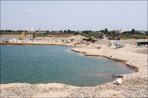 Photo 1 – An extraction site (shovels and trucks) in a gravel bar downstream of Vientiane.