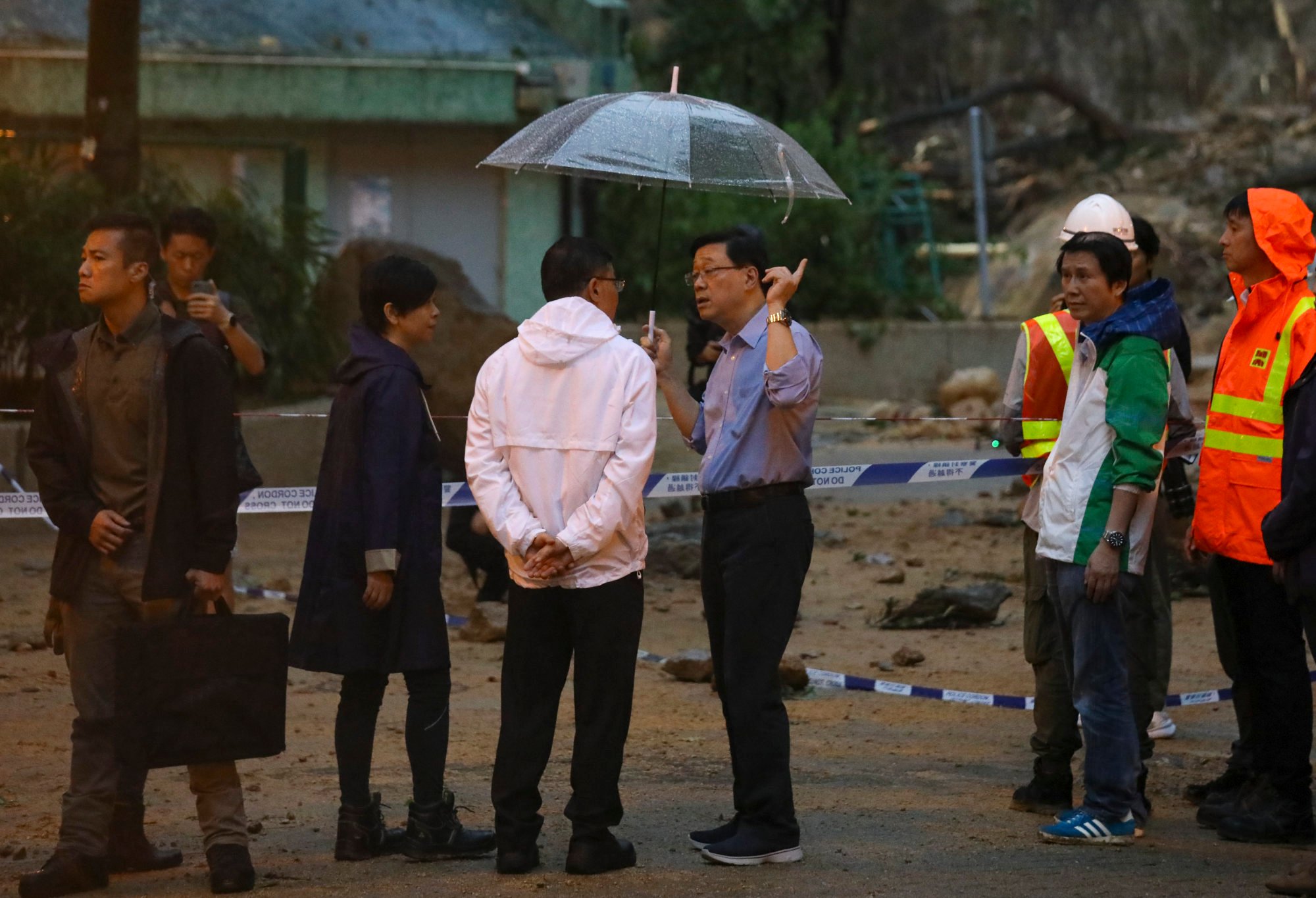 Chief Executive John Lee inspected the site of a landslide at Yiu Tung Estate in Shau Kei Wan at around 6pm, listening to reports from officials on the latest situation at the scene.
