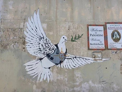The art is cynical, yet hopeful. It depicts the trauma and tragedy of the Palestinians behind the wall through sneering humor and clever, thought-provoking images. It is uncomfortable, dark, and haunting. The symbol of peace carrying an olive branch, sporting a flak jacket, with a target on its chest, for example.