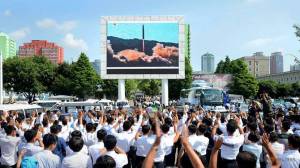 FILE PHOTO: People watch a huge screen showing the test launch of intercontinental ballistic missile Hwasong-14. KCNA/via REUTERS