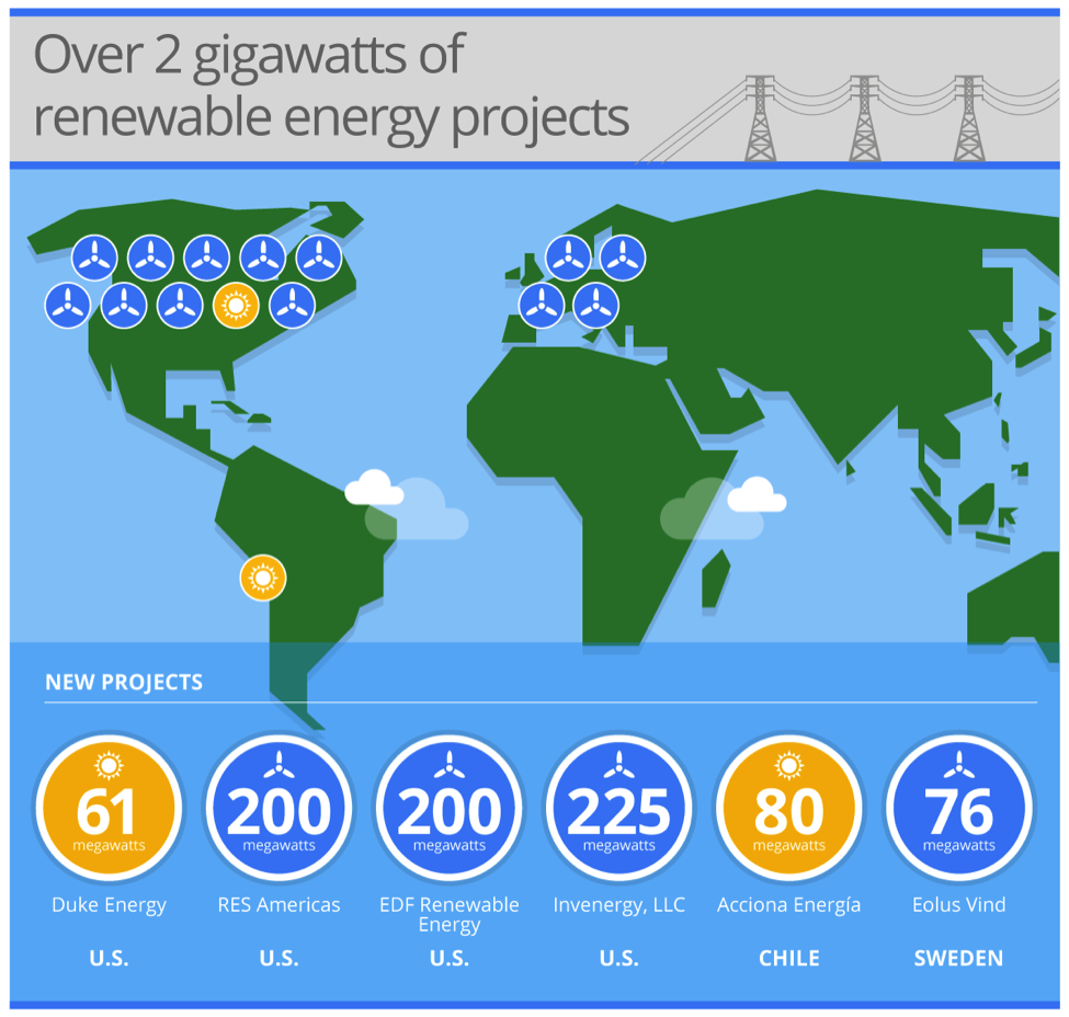 Googleblog – Today we’re announcing the largest, and most diverse, purchase of renewable energy ever made by a non-utility company. Google has already committed to purchase more renewable energy than any other company. Now, through a series of new wind and solar projects around the world, we’re one step closer to our commitment to triple our purchases of renewable energy by 2025 and our goal of powering 100% of our operations with clean energy. 842 MW of renewable energy around the world Today’s agreements will add an additional 842 megawatts of renewable energy capacity to power our data centers. Across three countries, we’re nearly doubling the amount of renewable energy we’ve purchased to date. We’re now up to 2 gigawatts—the equivalent to taking nearly 1 million cars off the road. These additional 842 megawatts represent a range of locations and technologies, from a wind farm in Sweden to a solar plant in Chile.